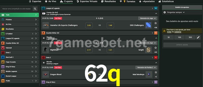 O 62q oferece uma grande seleção de opções de apostas em e-sports com probabilidades competitivas
